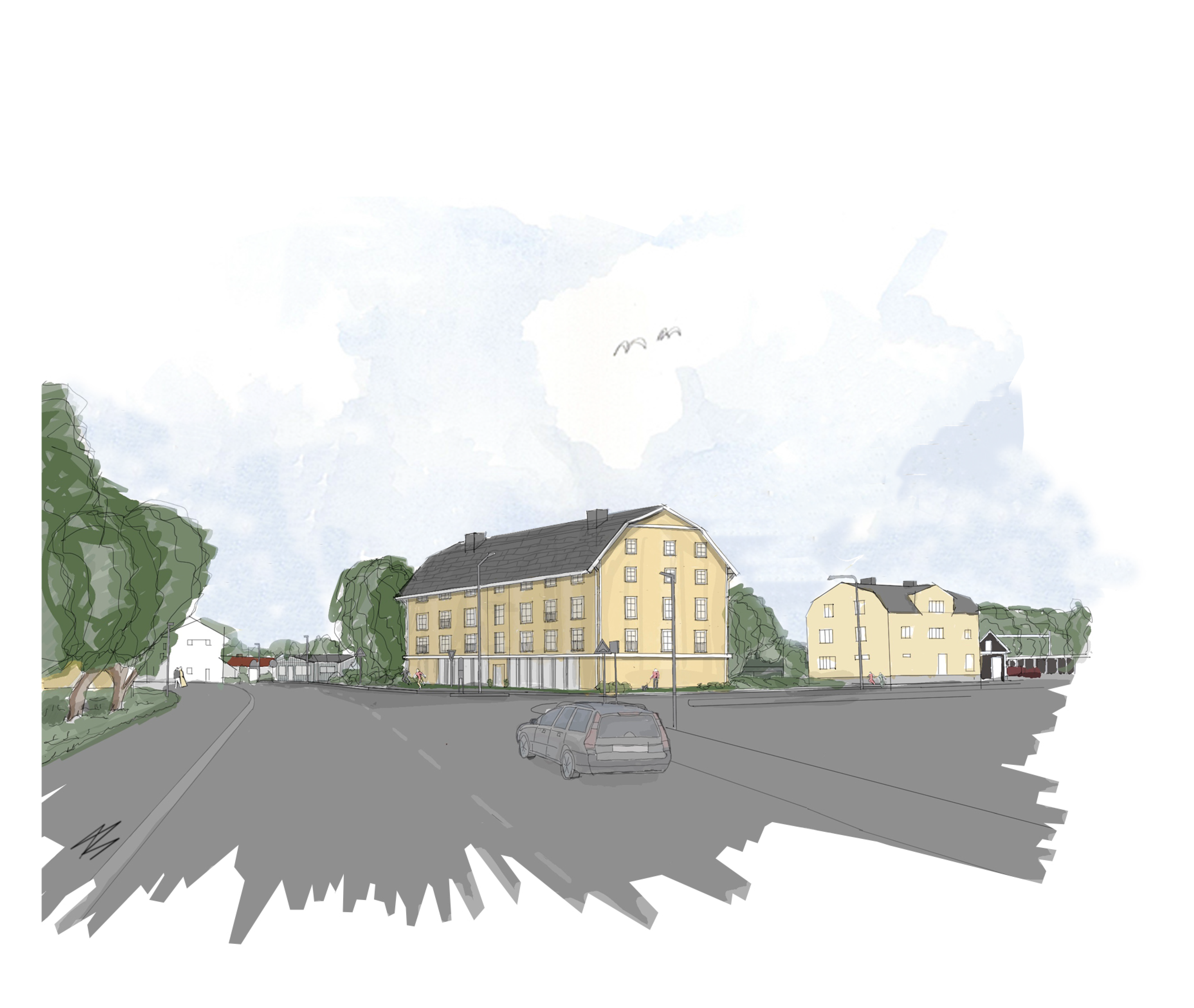 Möjlig utformning av flerbostadshus (Illustration: Filip Wikman, Sundsvalls kommun).